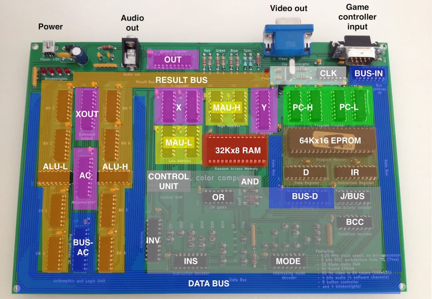 Although there is no discrete CPU chip, the TTL logic forms a powerful 8 bit computer that you can use to play games, run applications, and even create your own software.