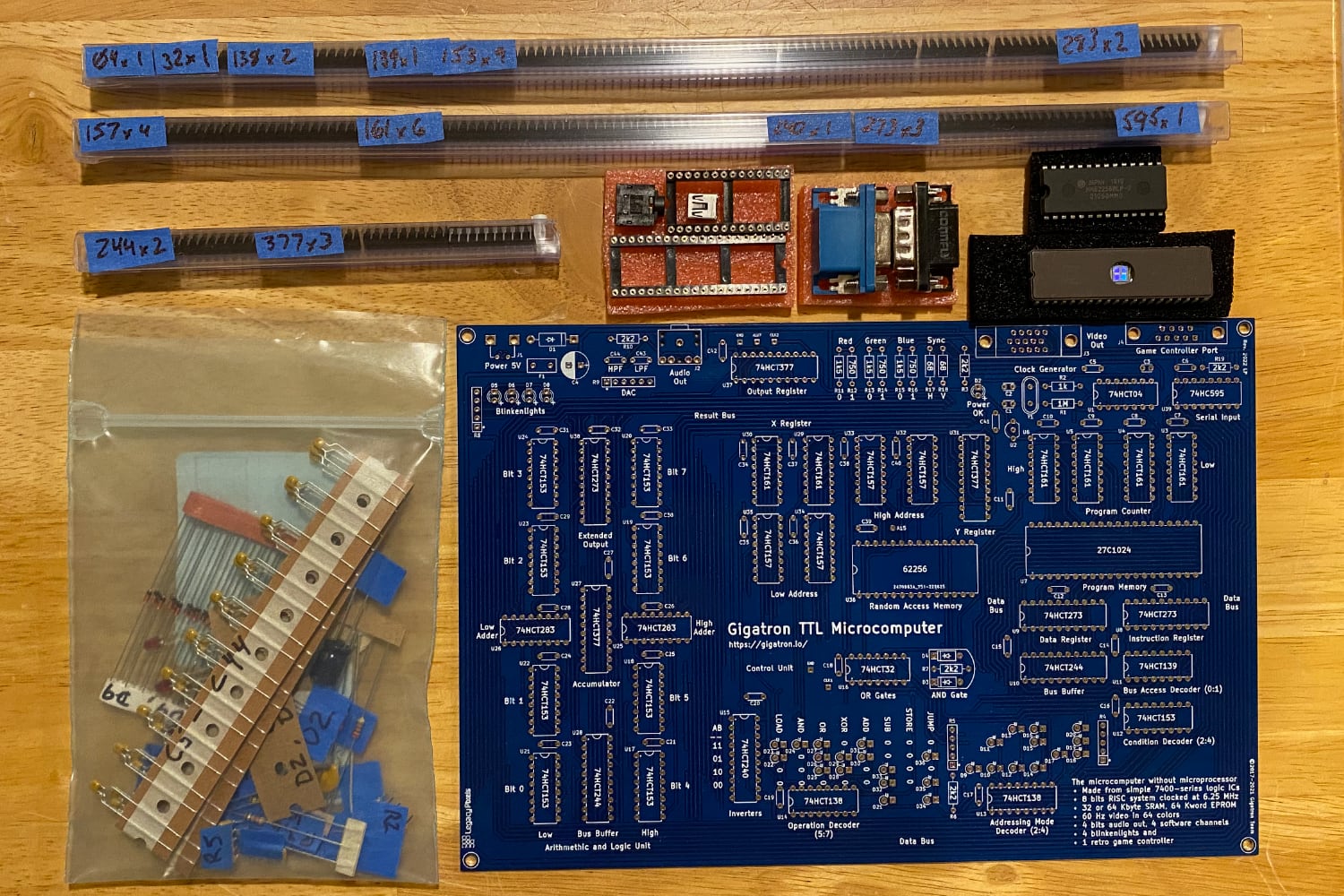 The Gigatron kit includes all the necessary components to build your very own Gigatron computer. Participate in a unique experience as you assemble your own machine, and learn about the concepts and inner workings of a computer system. All kit components are through-hole versions, making assembly less challenging. The needed tools are a soldering iron, solder, a multi-meter and some patience. The online documentation even includes a basic soldering tutorial.