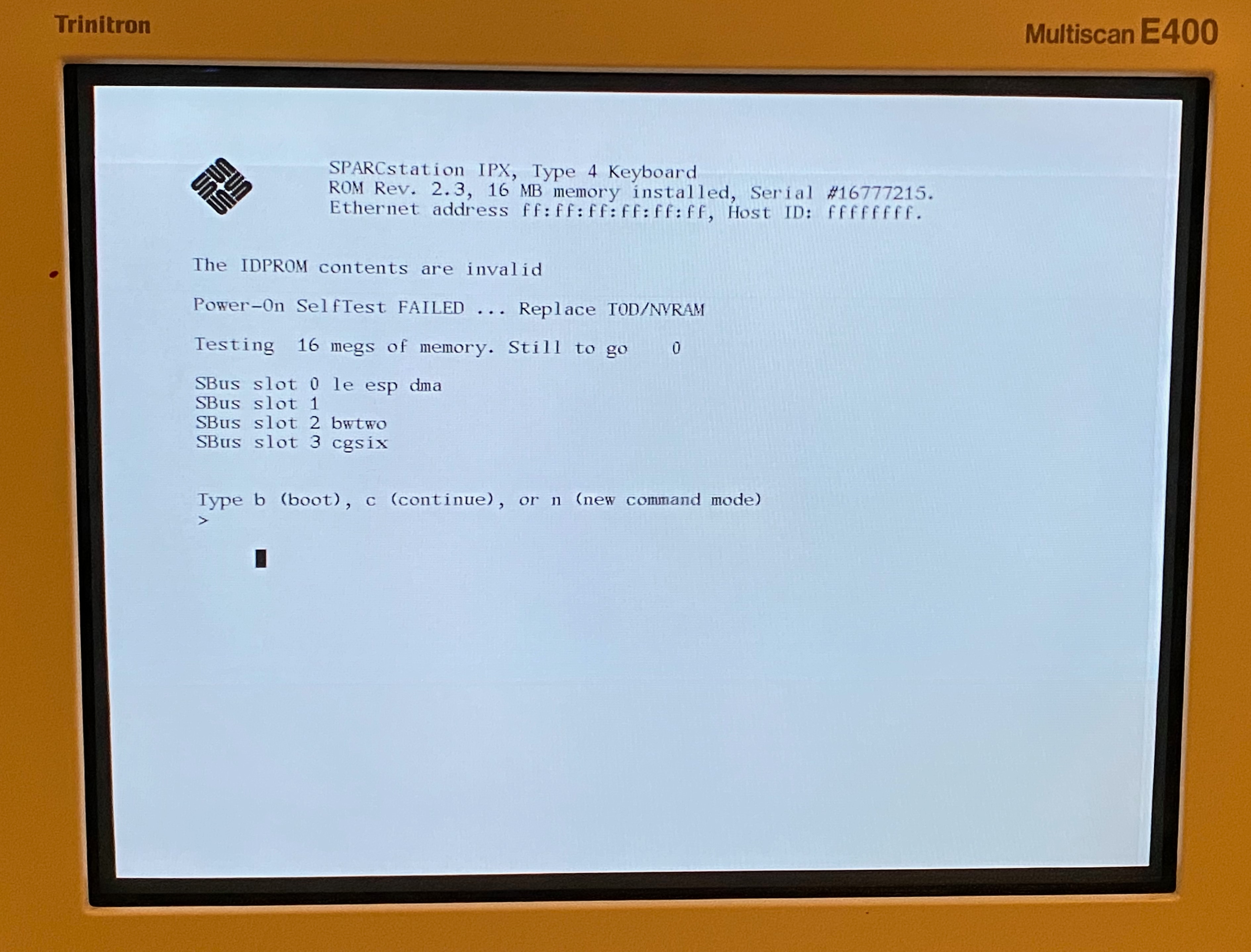 Sun SPARCstation IPX Sun MG1 Mono Frame Buffer 1152x900 Sun boot screen Sony Trinitron E400 |