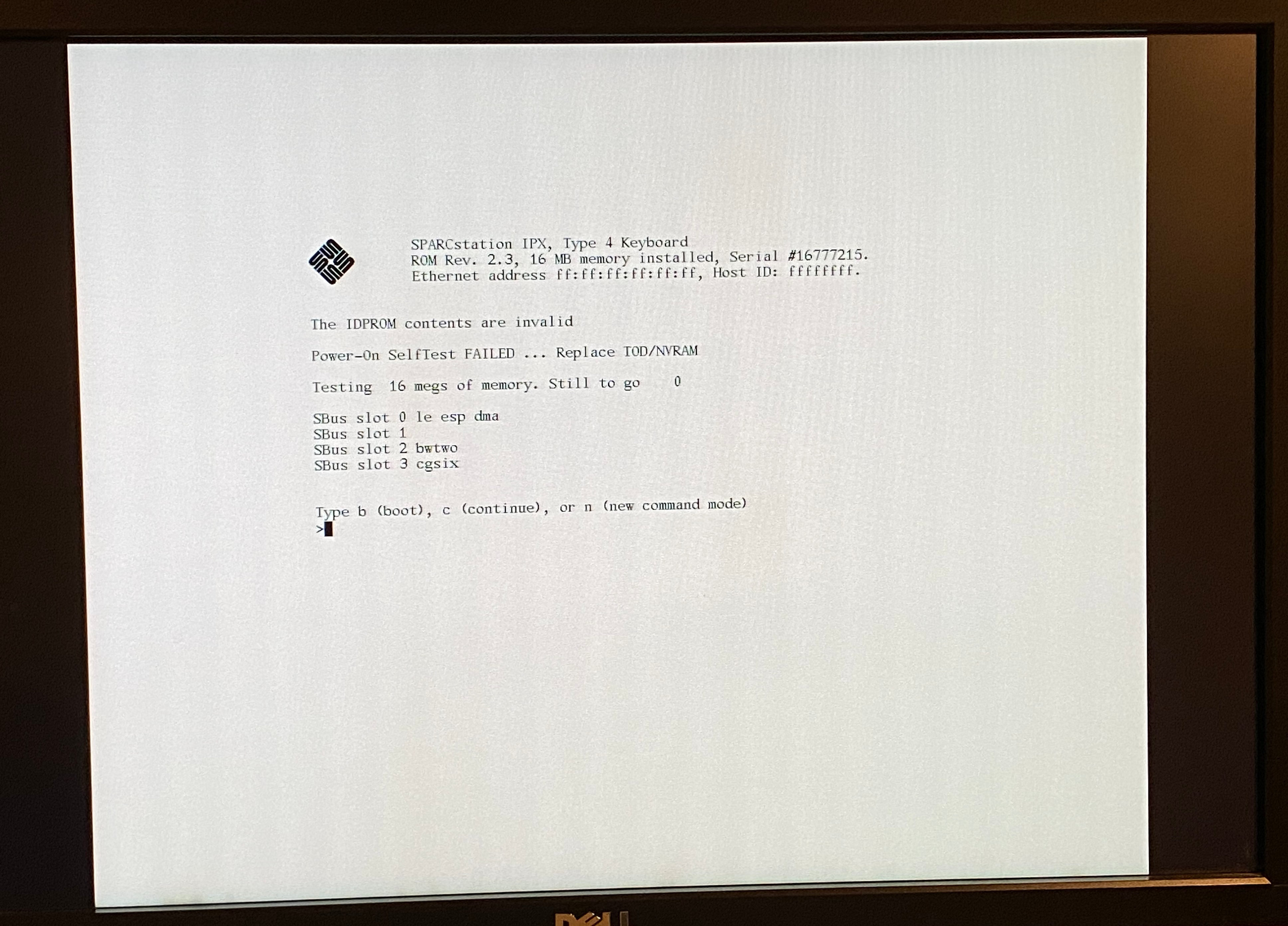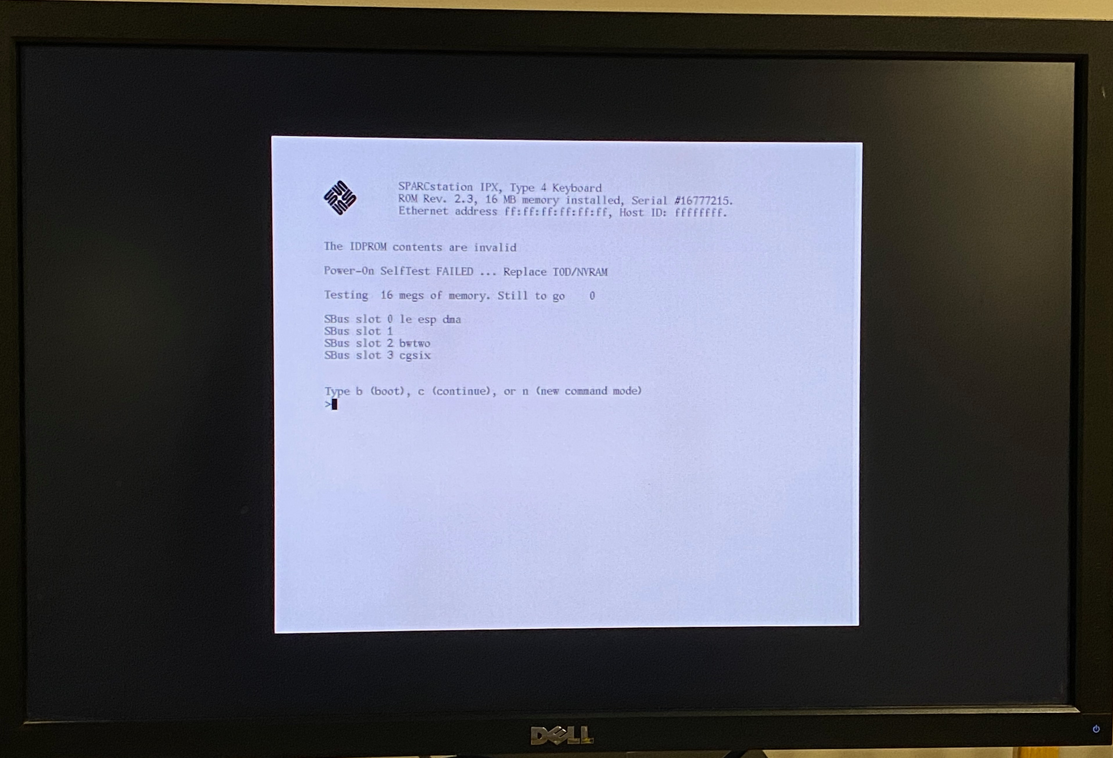 Sun SPARCstation IPX Sun MG1 Mono Frame Buffer 1600x1200 Sun boot screen Dell U2410 |
